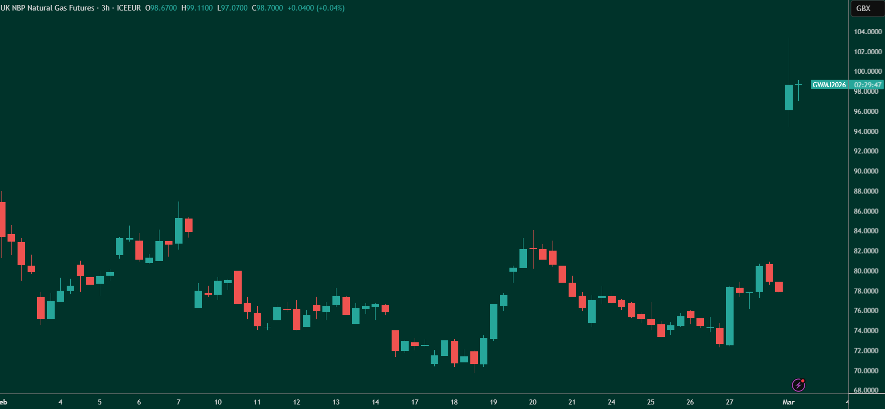 Electricity prices for the Summer’26 season had dropped as low as £65.66/MWh in mid-February, but opened up at £79.70/MWh this morning, showing an over 20% increase from this low point. Meanwhile, wholesale UK gas prices are trading 25% higher than when the market closed on Friday. For a business set to consume 10,000MWh of electricity during the summer, this represents a price increase of over £140,000 when comparing today’s price to the February low point.